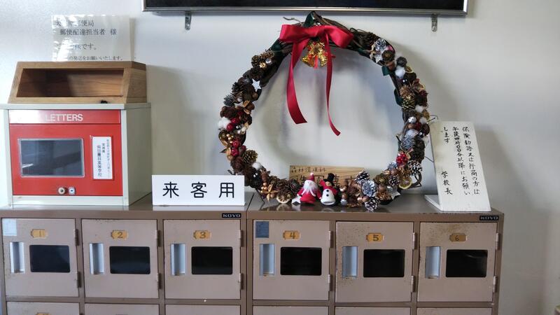 正面玄関にクリスマスリースが飾られました。森林環境科3年生の造園の授業で生徒たちが製作したものです。直径は70センチメートルと大変大きく、サンタクロースなどのかわいらしい飾りが施されており、玄関に彩りを添えています。