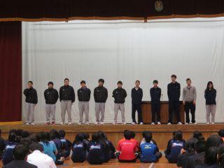 仙南総体の報告会と,県総体へ出場する部活動の壮行式を行いました。