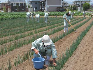 ネギの土寄せ除草の様子です。