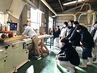 講習会では、低コスト造林地→製材工場→乾燥工場→木材センター→モデルハウス「さとのえ」、という山から家までの流れを視察し、それぞれの現場で社員の皆様から技術的な内容はもちろん、働くことのやりがいや大変さなど熱いお話しをいただきました。専攻学習だけでなく、将来の仕事についても考えるよい機会となりました。