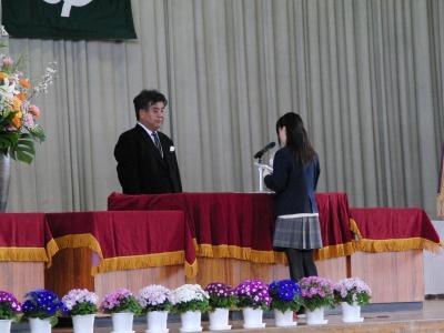 離任される先生方からお別れの言葉を頂き、生徒からは送る言葉と花束の贈呈がありました。